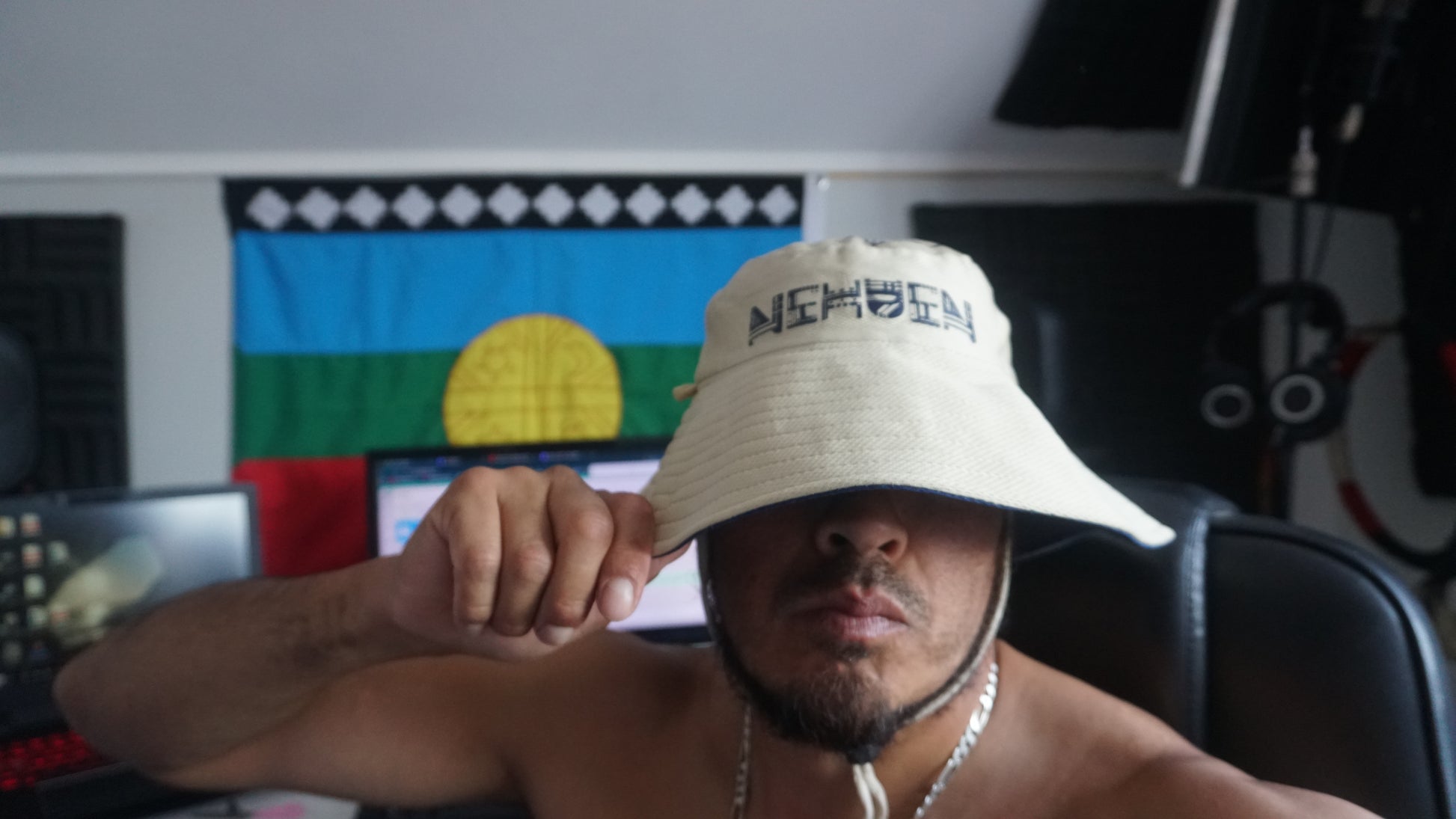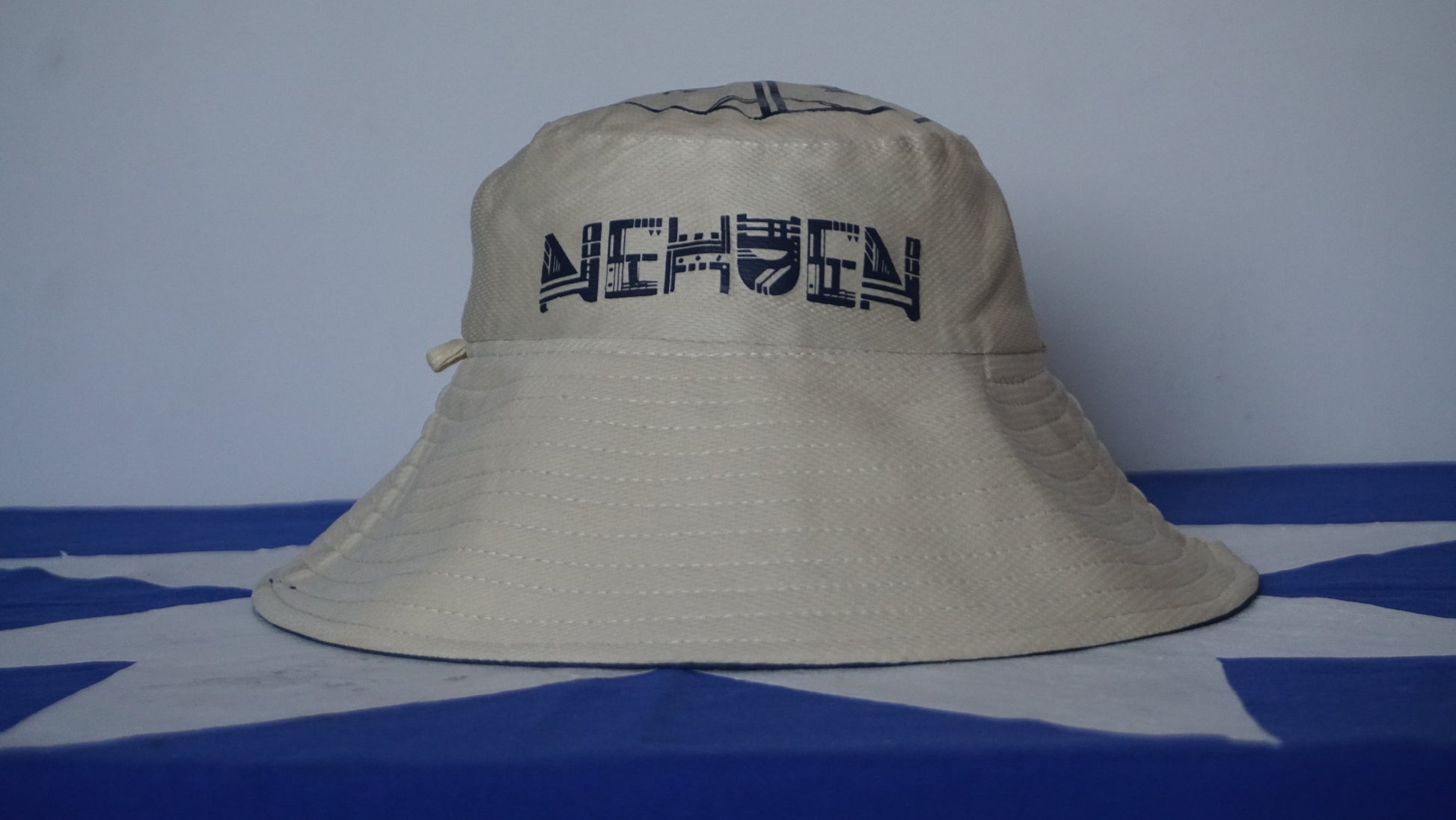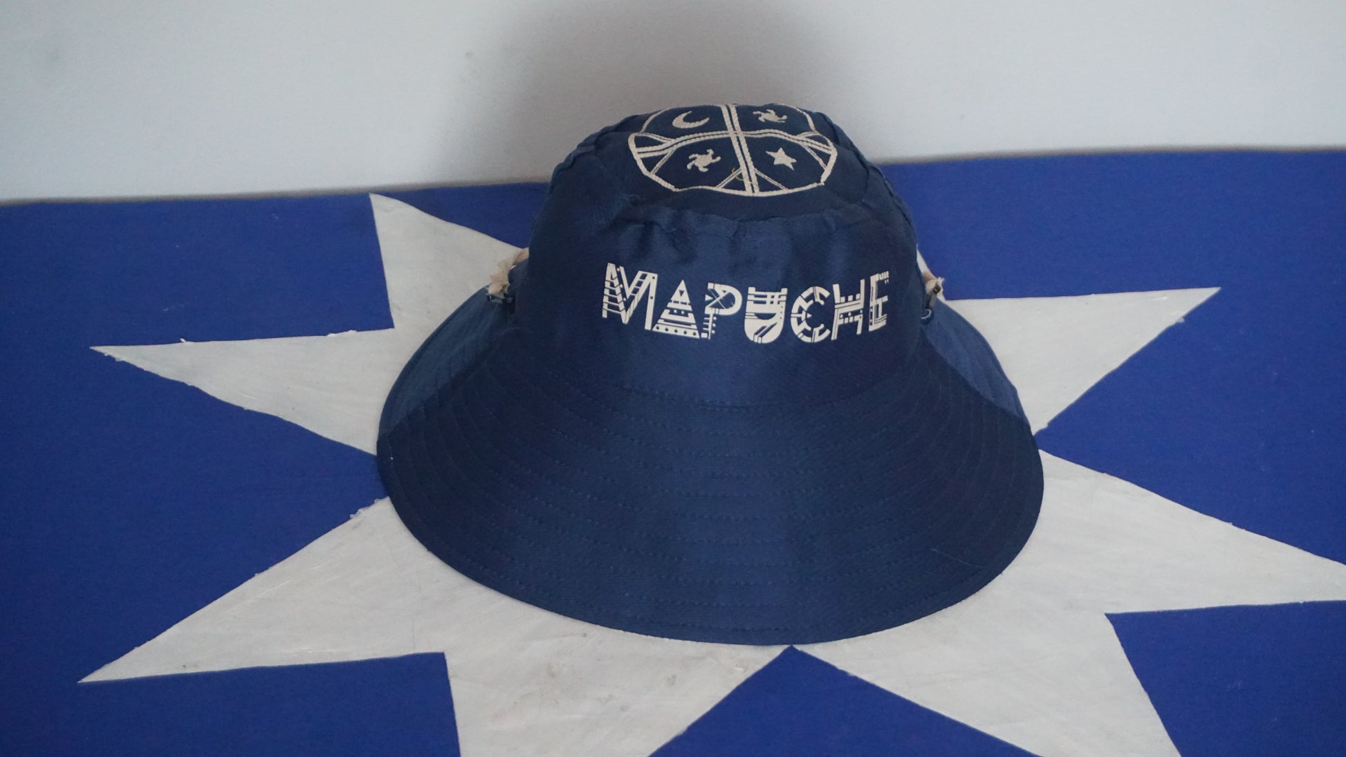 Gorro pescador 100% de algodón de muy buena calidad reversible. En la parte azul con la frase Mapuche "gente de la tierra" y en la parte arriba el kültrun mapuche" con vinilo color beige. Por el otro lado en la parte beige la frase "Nehuen" que en mapuzdungun significa fuerza o energía y en la parte de arriba el kültrun mapuche, con estampado en color azul marino. (este gorro pescador es mas grande y tiene unos tirantes para apretarlo).