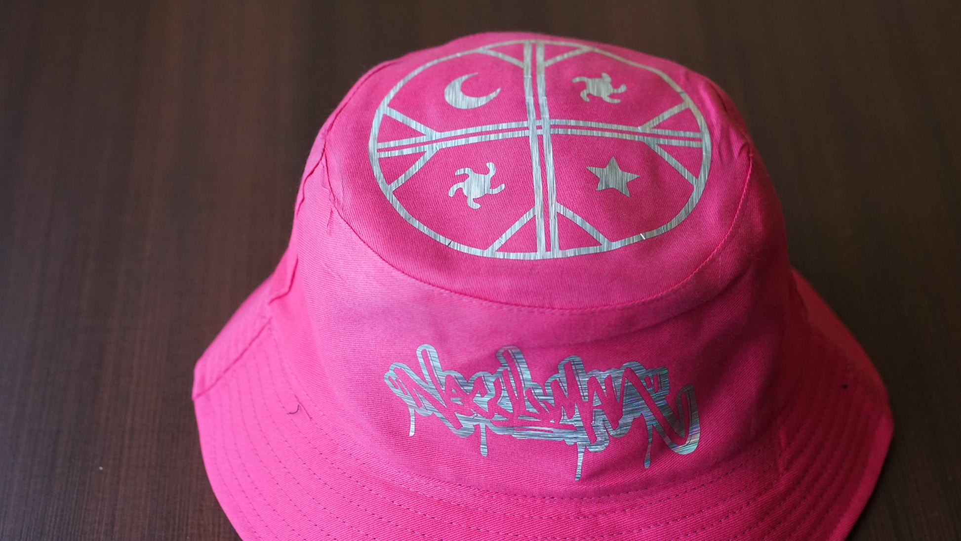Gorro pescador 100% de algodón de muy buena calidad reversible, con vinilo holográfico y estampado del tag Neculman en la parte frontal y símbología de la cosmovisión mapuche en la parte de arriba. En la parte Negra tiene el cóndor Neculman en fucsia y puede ser el kultrun, el sol o el símbolo de la primera línea.