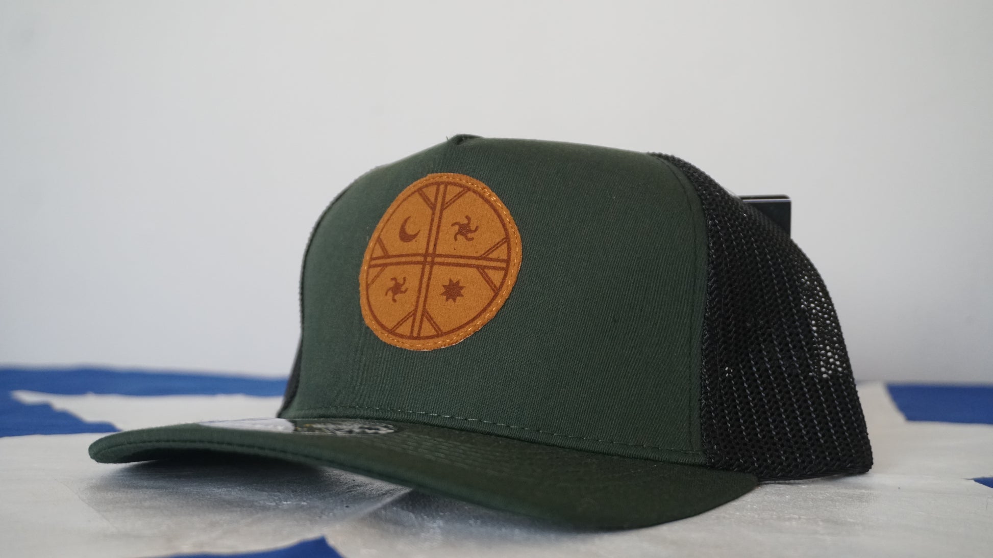 Jockey de vicera plana, con estrella "Weñelfe", Hualmapu Libre y Kültrun mapuche, con parche de cuero y estampado en laser. Disponible en verde y azul