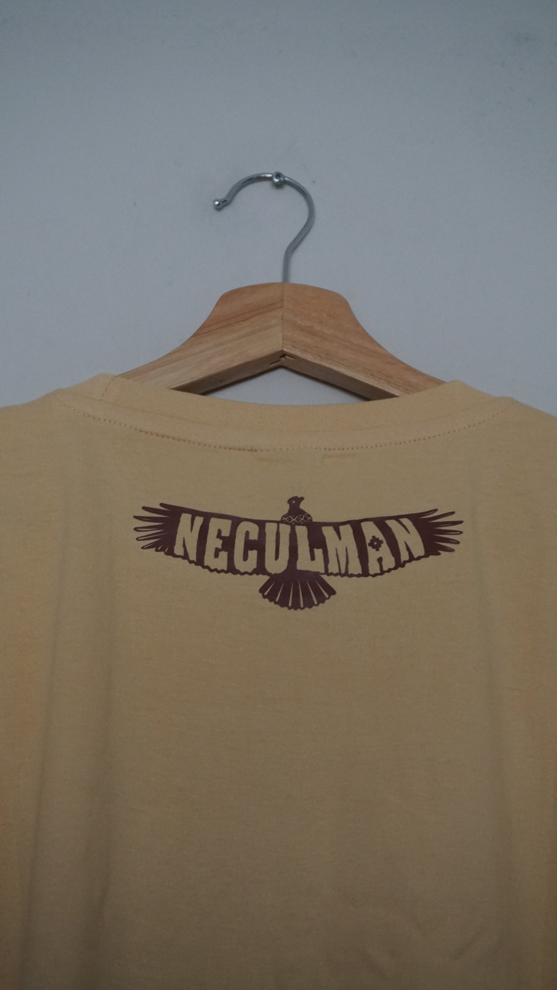 Polera manga corta 100% de algodón, con diseño frontal de Araucarias y en la parte de abajo con la frase " Wallmapu Libre" . En la parte trasera puede ir un Cóndor de la marca "Neculman". Disponible en todas las tallas y colores.