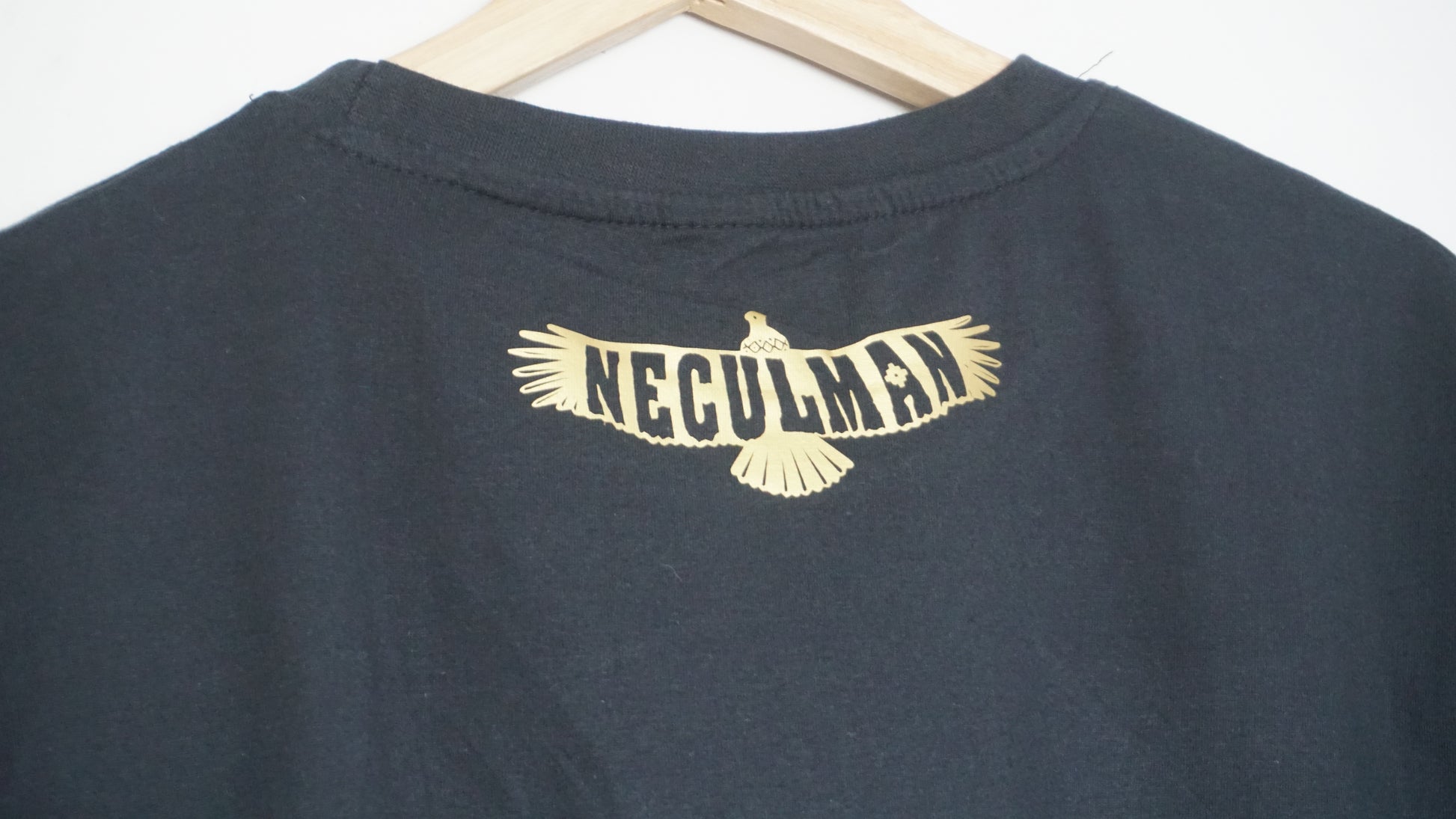 Polera manga corta 100% de algodón, con diseño frontal de "Kültrun Mapuche" y frase de Meli huitran mapü( Los cuatro puntos cardinales del territorio mapuche) y en la parte de atrás Cóndor Neculman en el cuello o en la parte de la cintura, si es mujer. El color principal de la polera es Negro y los diseños en dorado, pero esta disponible en todas las tallas y colores.