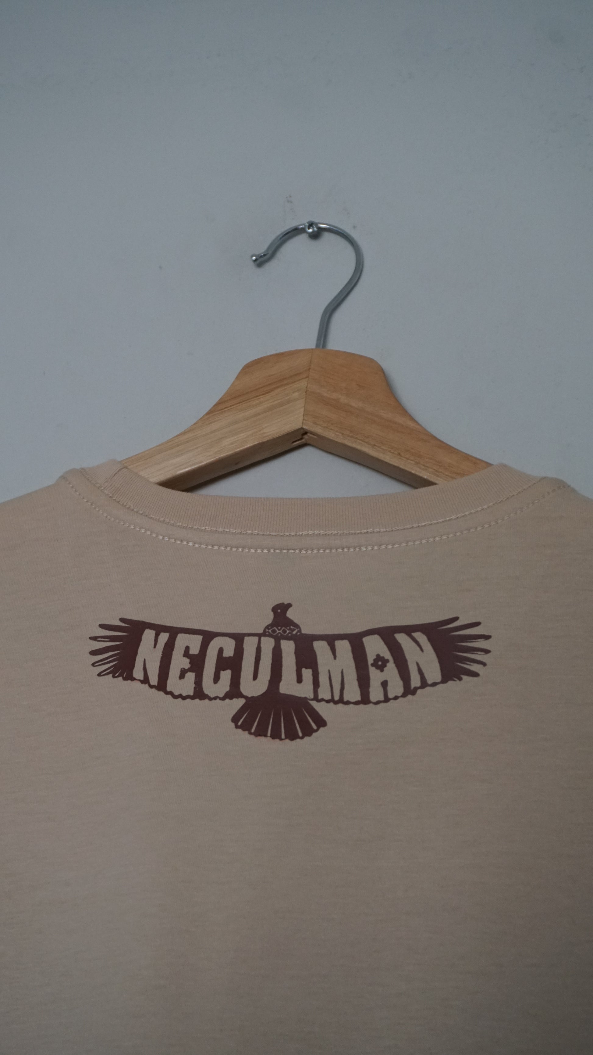 Polera exclusiva Antü, con diseño frontal del sol en la parte frontal y el cóndor Neculman en la espalda. Disponible en todas las tallas en color naranjo y negro.