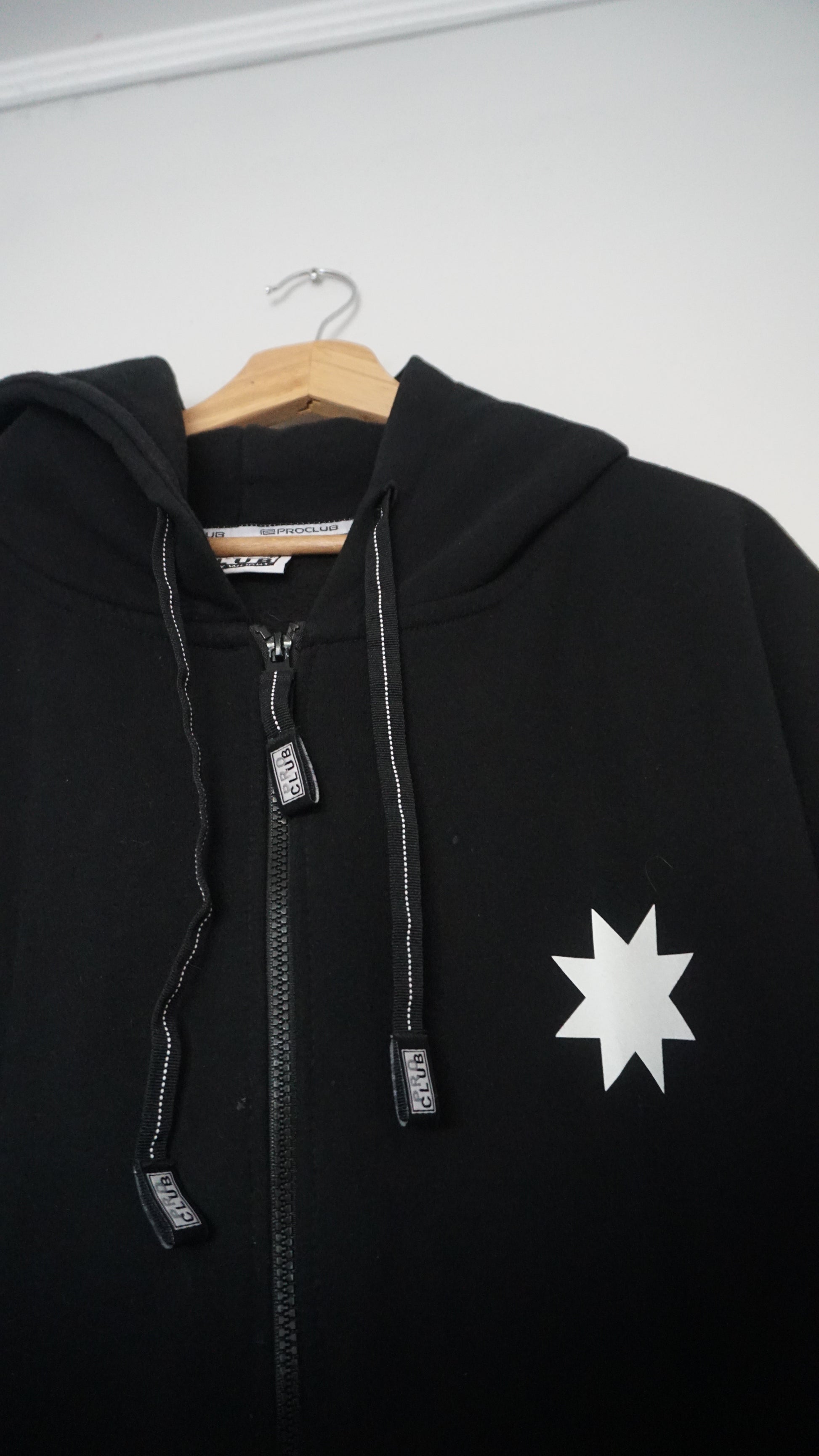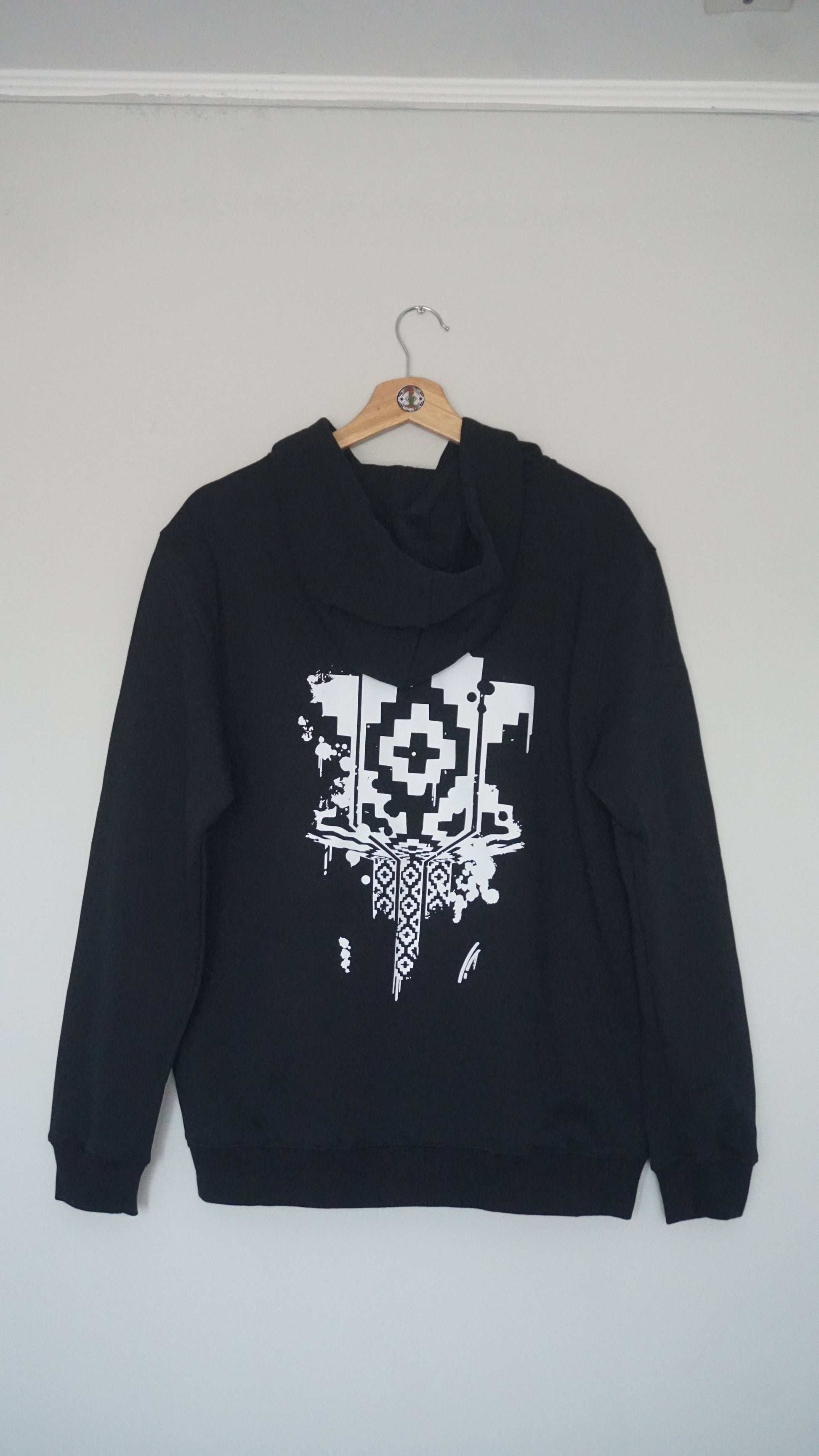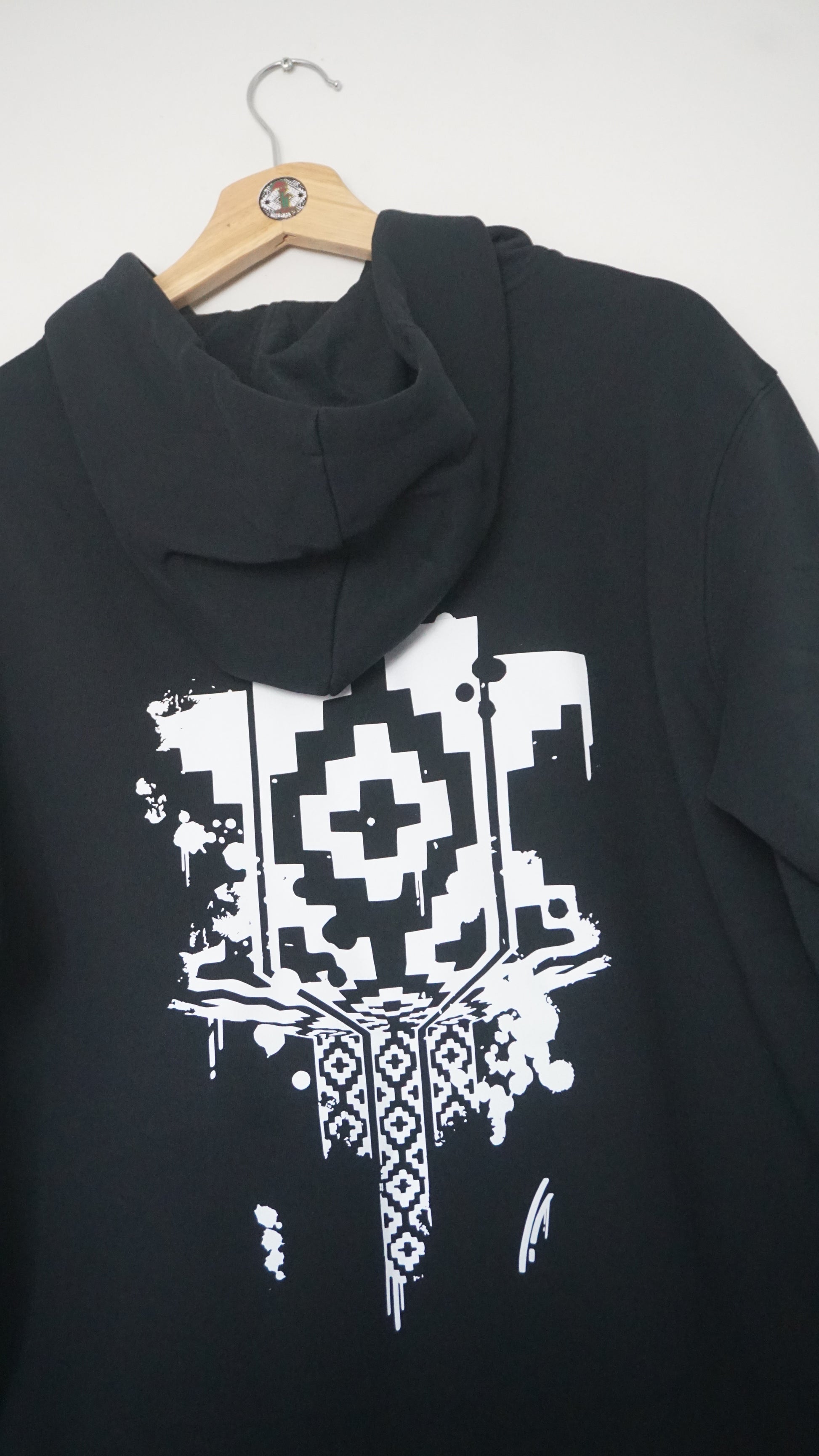 Poleron 100% de algodón con cierre y capuchón, estampado en vinilo con diseño de estrella del Lucero "Weñelfe", estampada en la parte izquierda y estampado de chacana Andina en la parte de atrás. Disponible en todas las tallas y en colores como el Negro, Rojo, Azul, entre otros.