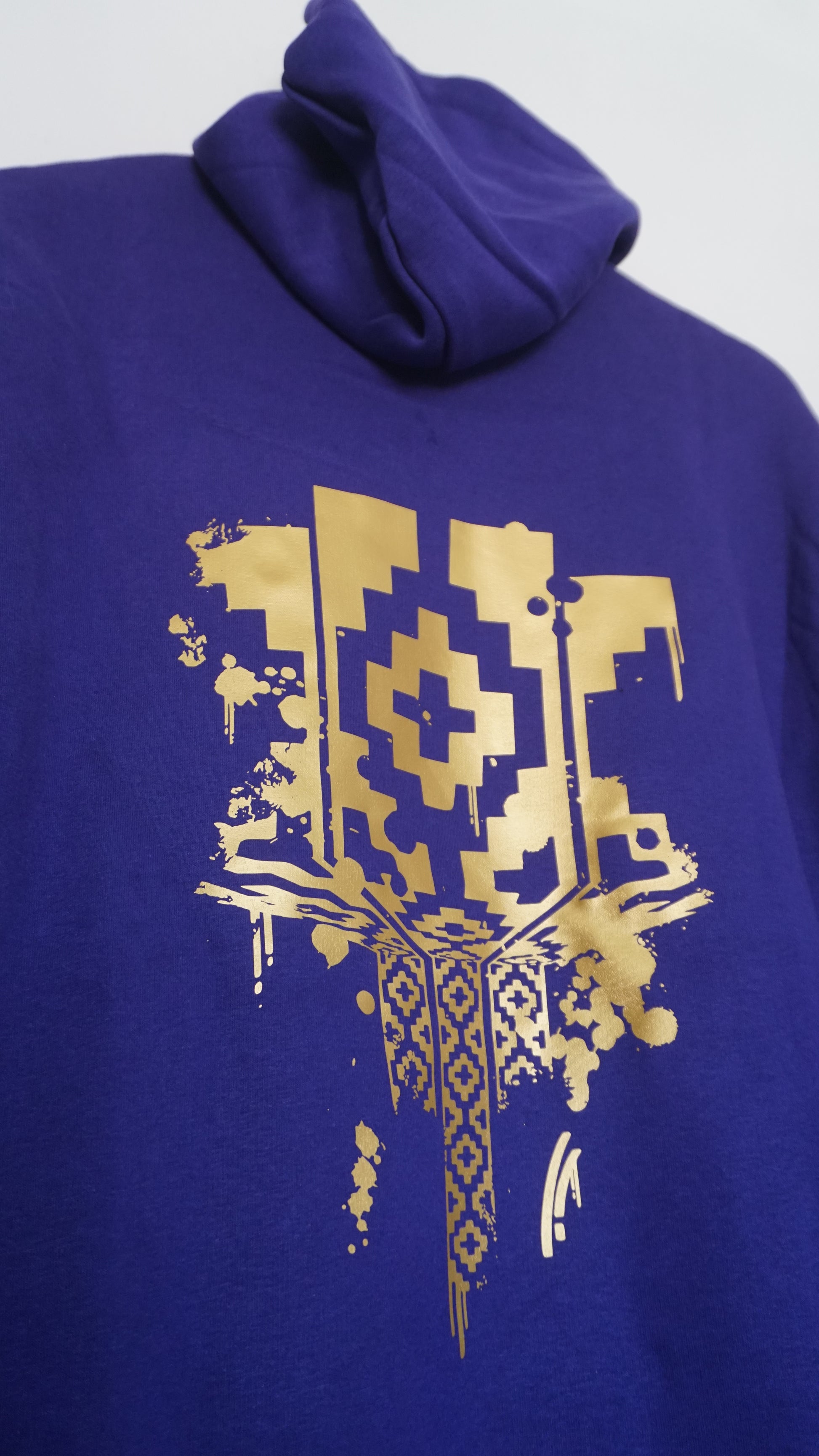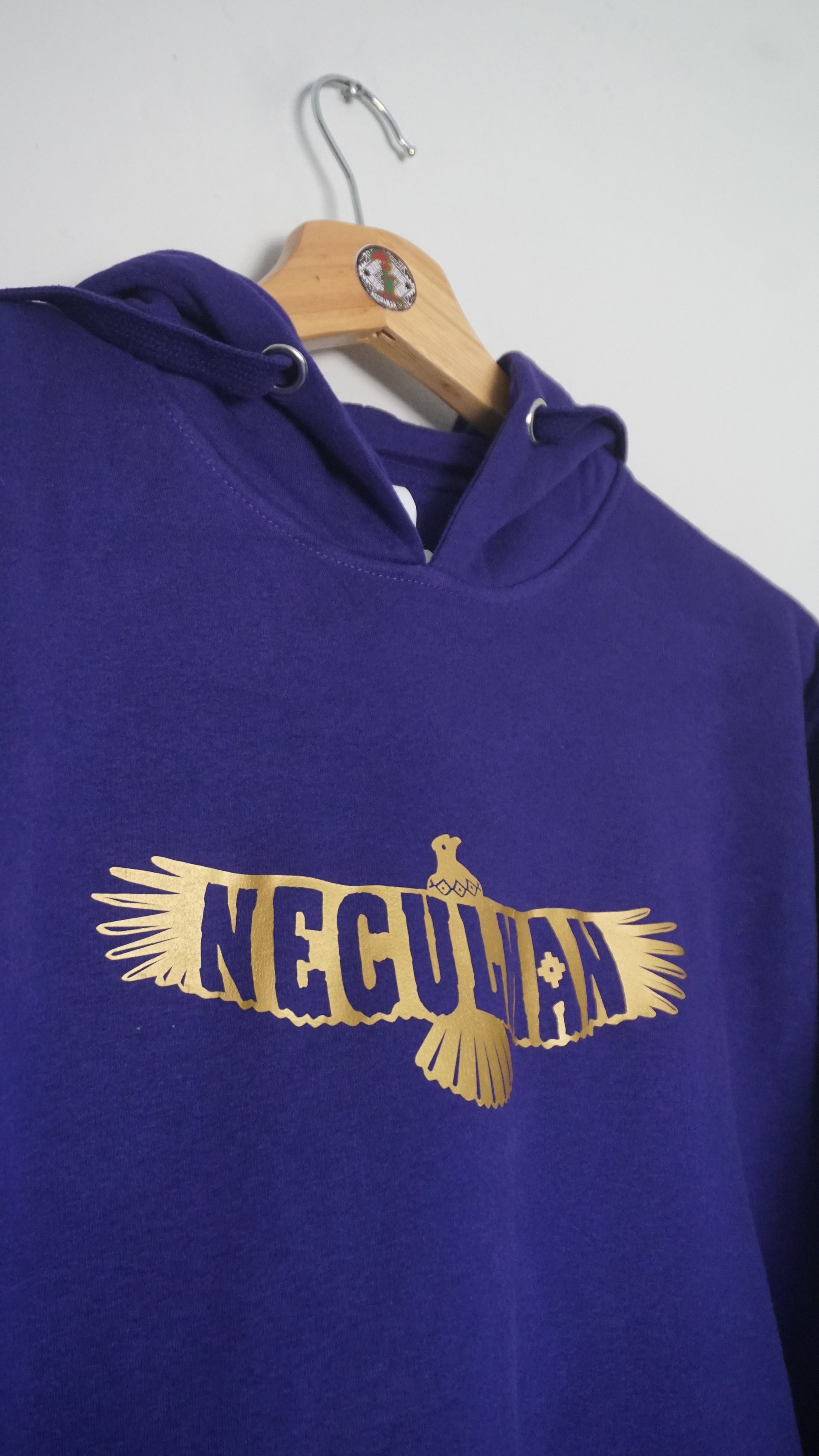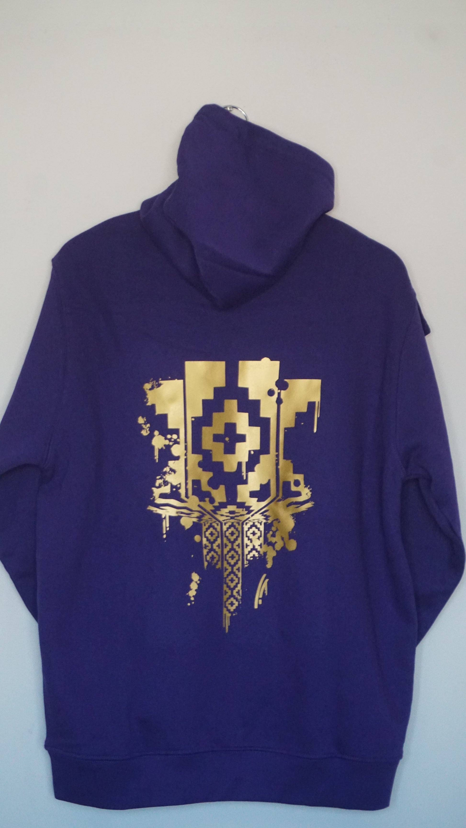 Poleron 100% de algodón con cierre y capuchón, estampado en vinilo dorado, con diseño de Cóndor "Neculman", en la parte frontal y estampado de chacana Andina en la parte de atrás. Disponible en todas las tallas y en colores como el Morado, Negro, Rojo, Azul, plomo, entre otros.