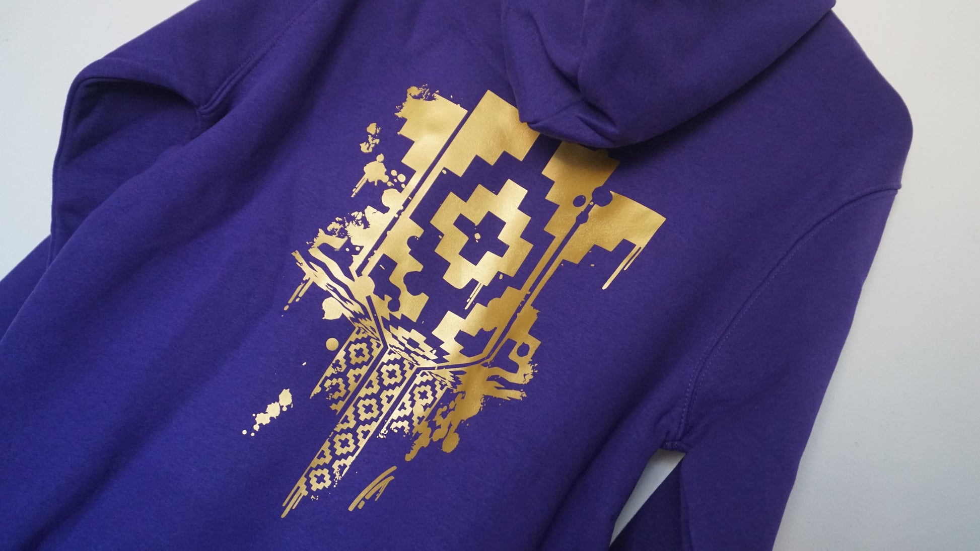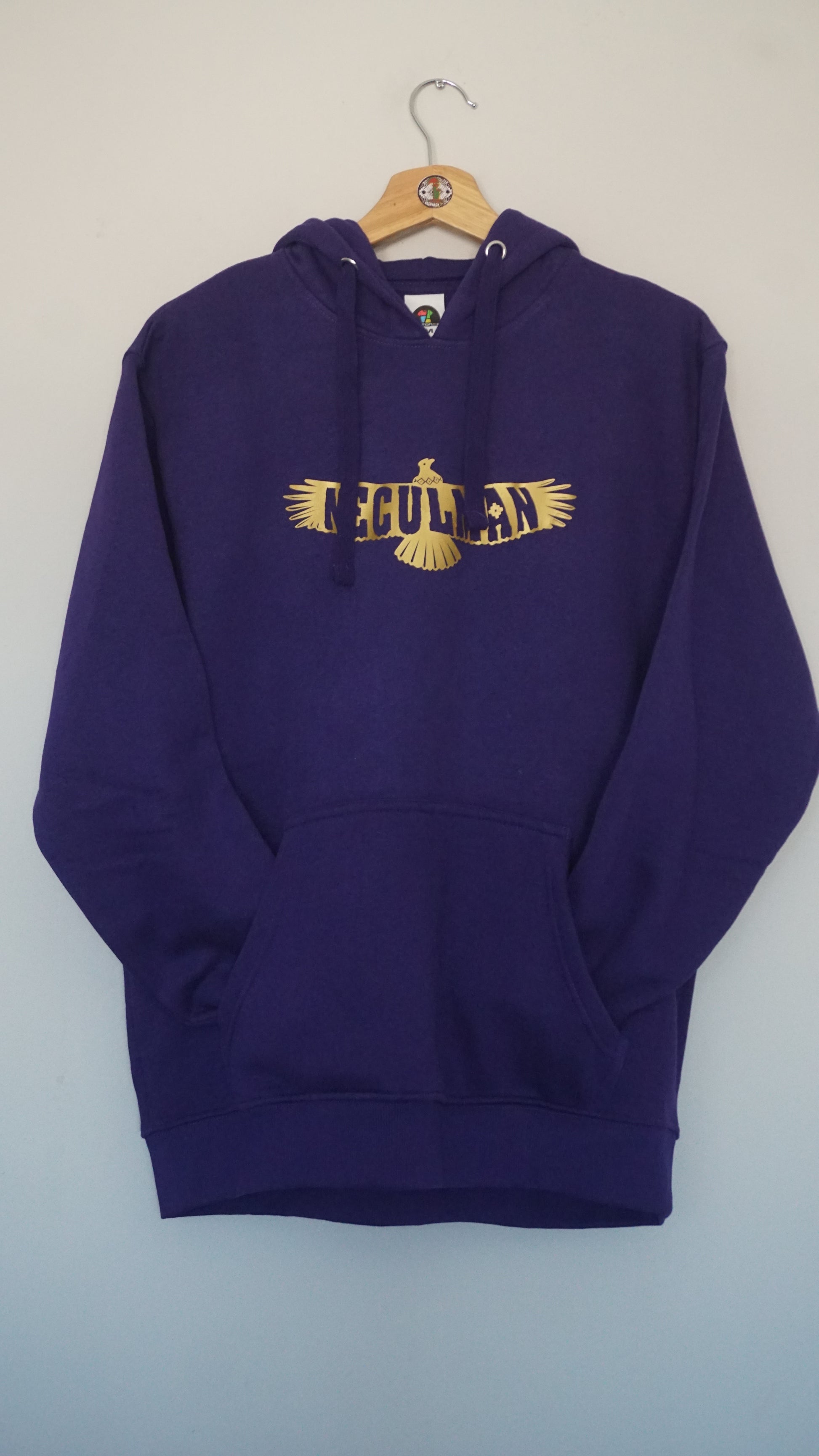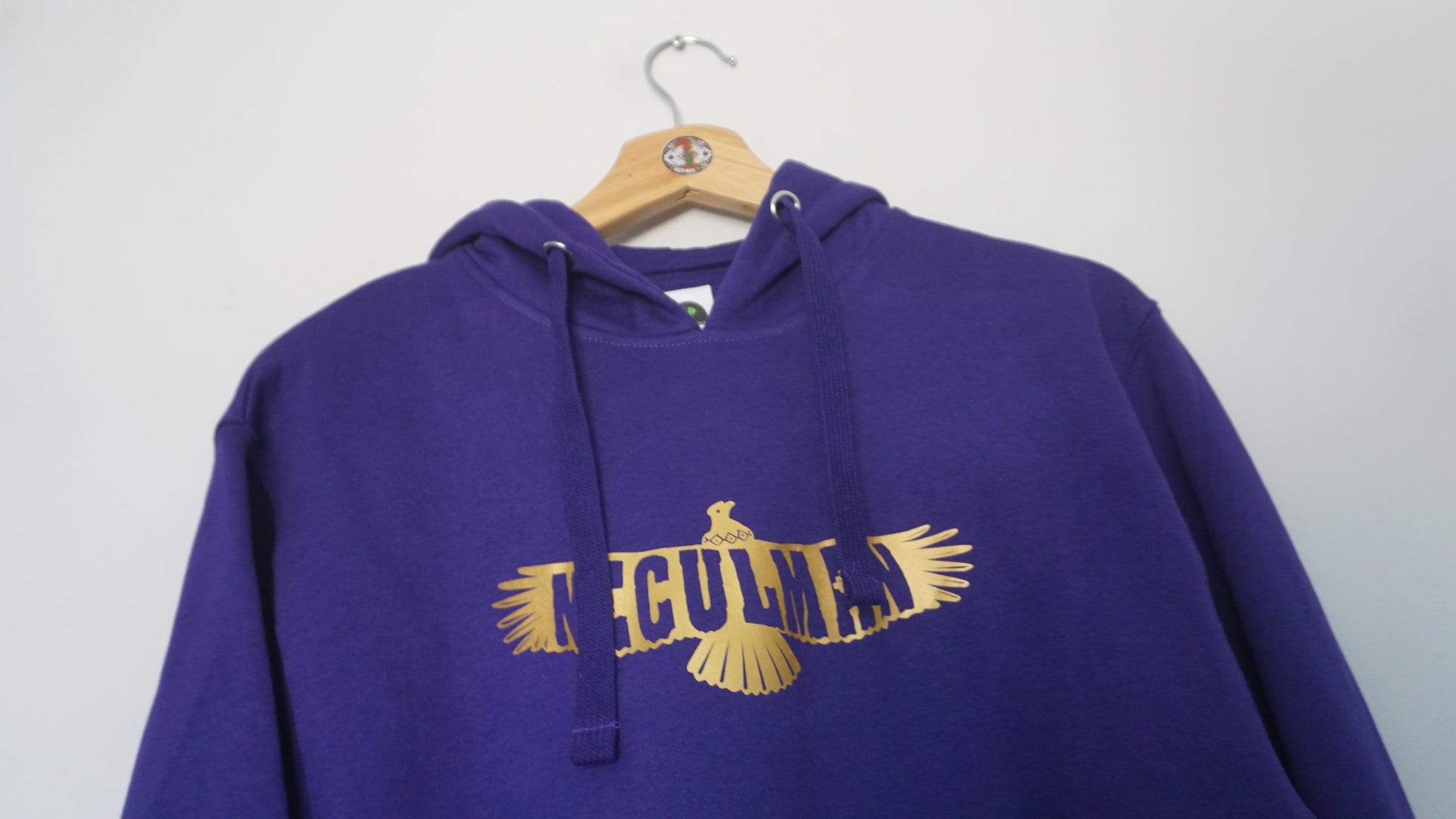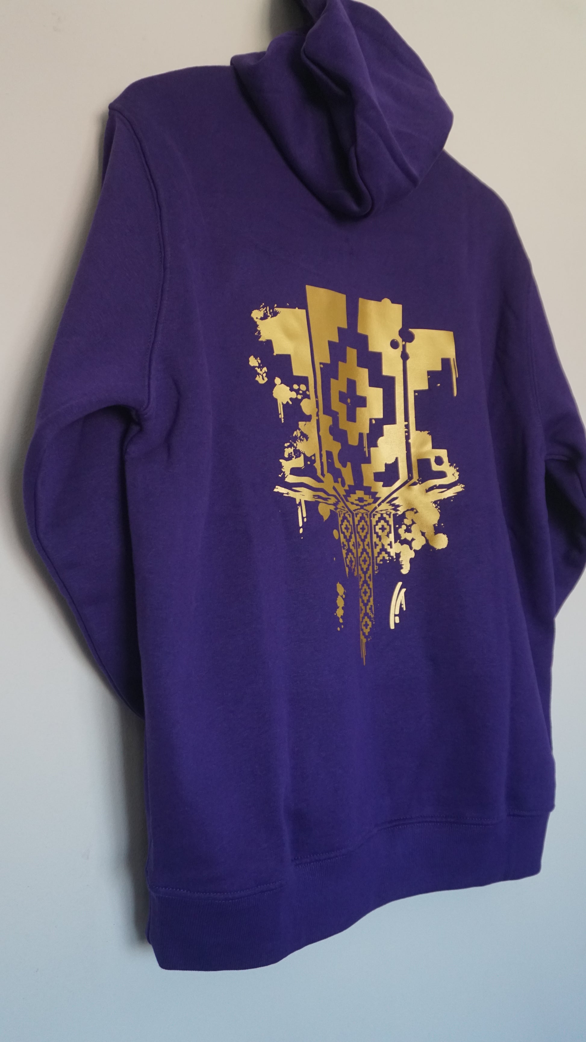Poleron 100% de algodón con cierre y capuchón, estampado en vinilo dorado, con diseño de Cóndor "Neculman", en la parte frontal y estampado de chacana Andina en la parte de atrás. Disponible en todas las tallas y en colores como el Morado, Negro, Rojo, Azul, plomo, entre otros.