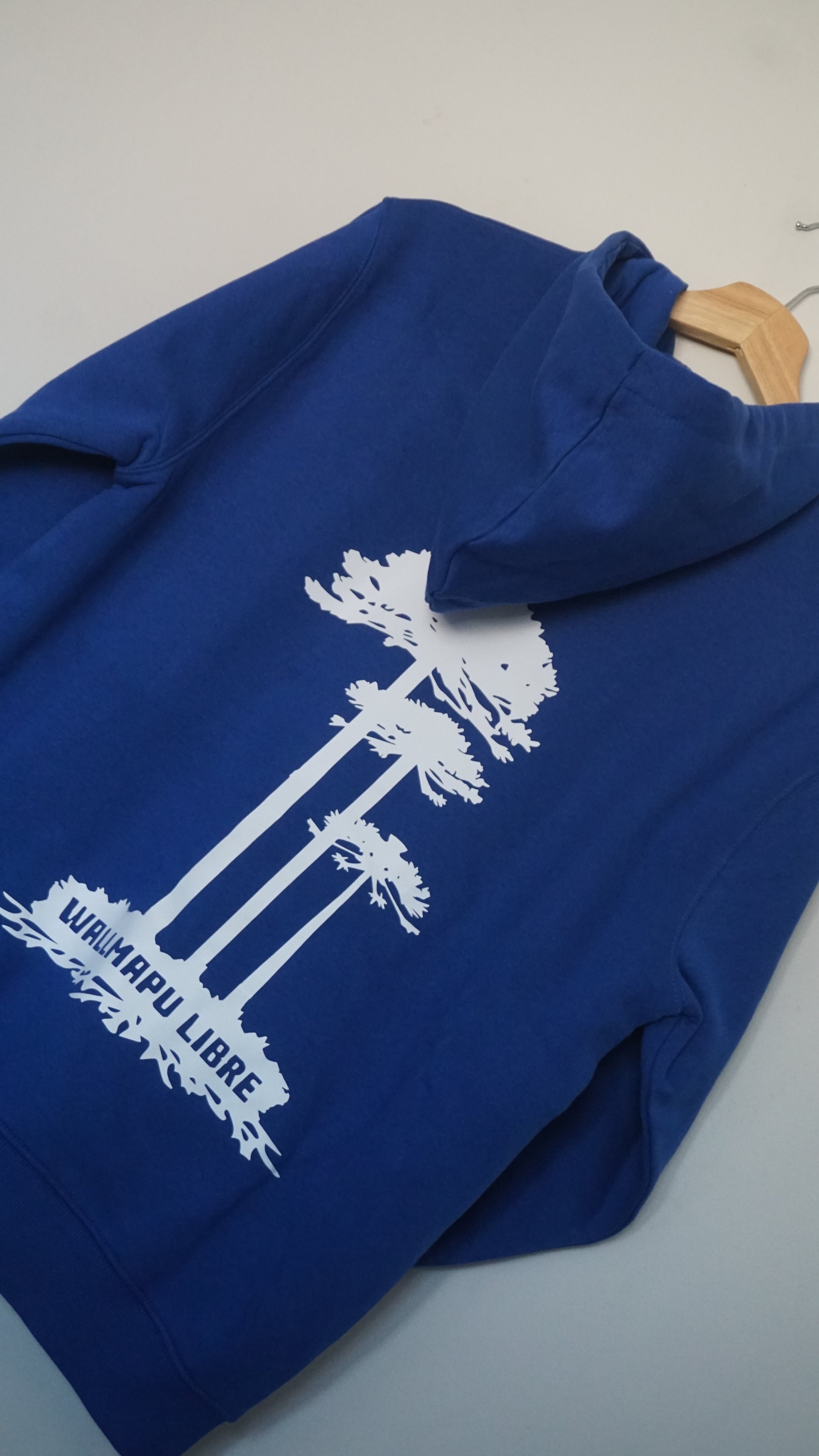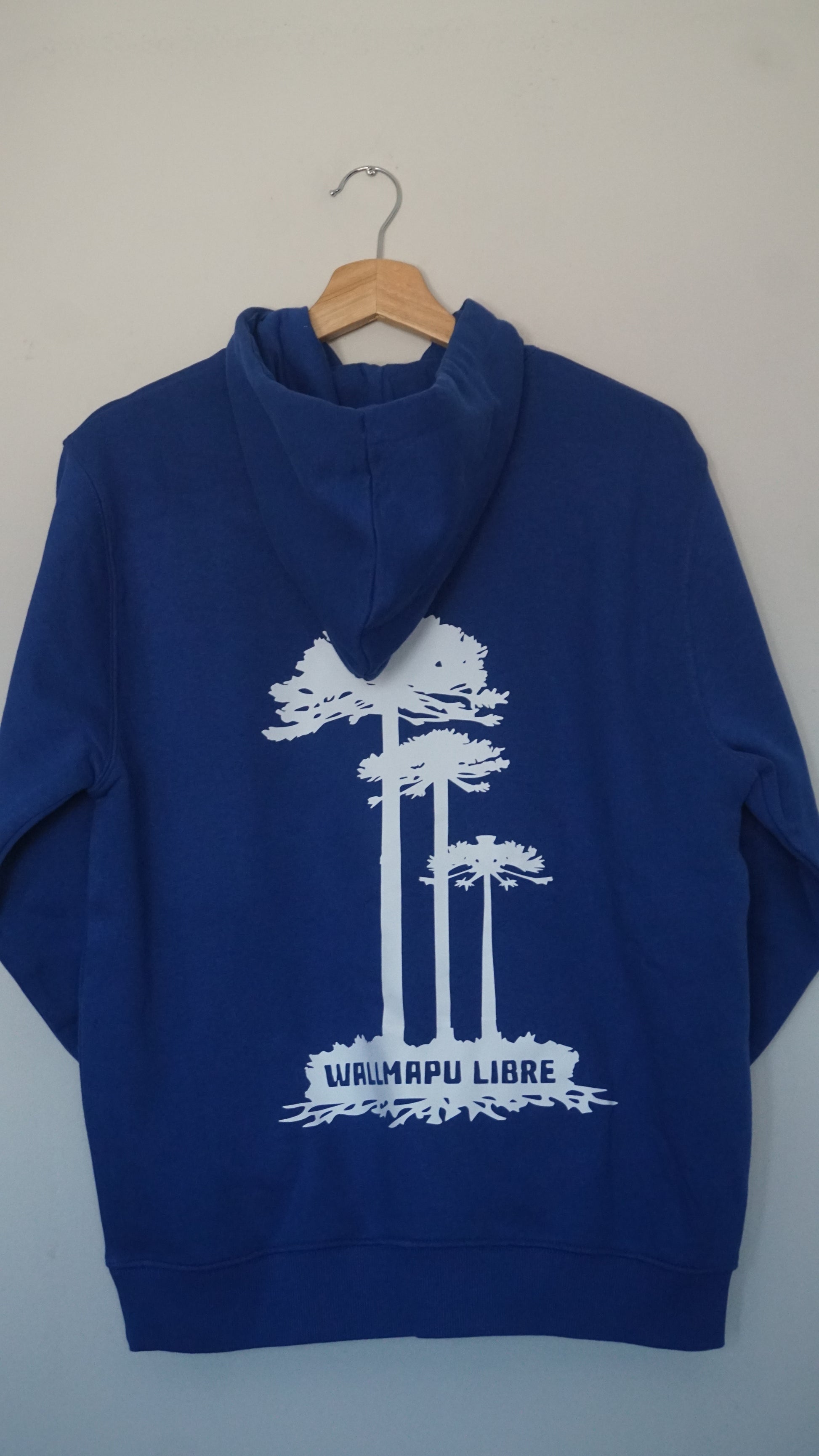 Poleron 100% de algodón con cierre y capuchón, estampado en vinilo con Cóndor "Neculman", en la parte frontal y estampado en la parte de atrás de tres Araucarias, mas la palabra "Wallmapu Libre". Disponible en todas las tallas y en colores como el azul, negro, rojo, entre otros.